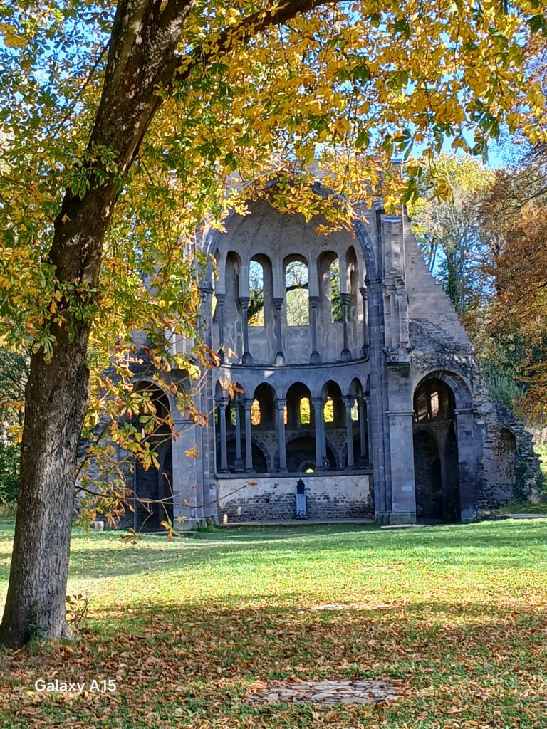 Klosterpforte Heisterbach zeigt. Unten Foto der Chorruine des Klosters im Spätsommerlicht. Fotos Weinbörner, 2021, frei.