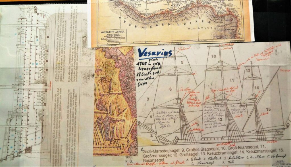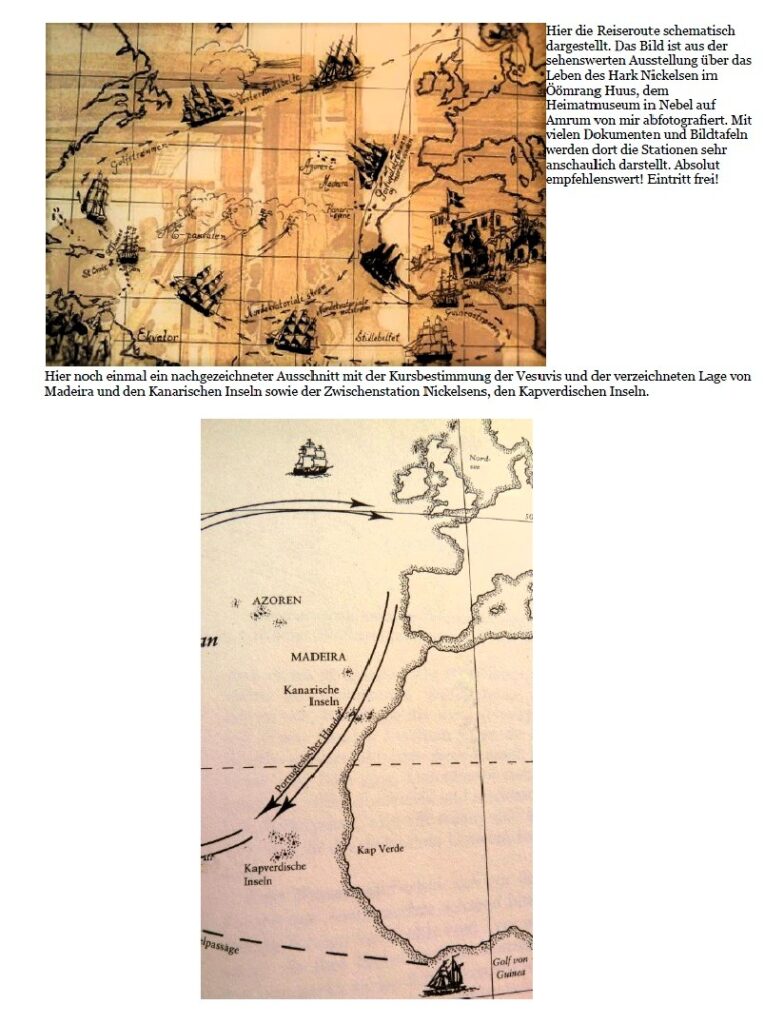 Der Schiffskurs: Die Schifffahrtsrouten im Roman orientieren sich an den Routen dieses Dreieckshandels und sie entsprechen den Beschreibungen der Logbücher, Lebensbeschreibungen anderer Seeleute und wurden mit Homepages verschiedener Segelclubs und Unterlagen aus Museen abgeglichen. Dabei ist klar, dass die Schiffe üblicherweise nördlich um die britischen Inseln nach Fort Christiansborg in Guinea und weiter nach Westindien segelten, dass sie zum Schutz gegen algerische Piraten mit Schutzbriefen ausgestattet waren und manchmal auch militärischen Geleitschutz genießen konnten. Nicht gesichert sind Nickelsens Zwischenstationen und die genauen Zeiten für das Erreichen von Zwischenzielen. Die Daten für die Ankunft in Christiansborg, Guinea, am 14. Oktober 1748 und in St. John (den heutigen Jungferninseln), Anfang März 1749 sowie die Rückkehr nach Kopenhagen im Juli 1749 und Nickelsens Tod am 24. Mai 1770 bilden die Eckpunkte für die Handlung des Romans. Apropos Geleitschutz: Tatsächlich gab es einen Kapitän Christian Friedrich Mechlenburg (einen Verwandten des Amrumer Pfarrers), der die Fregatte ‚Jaegerspris‘ führte. Nur im wirklichen Leben haben Nickelsen und er wohl 1746 – also vor dieser letzten Fahrt von Nickelsen auf der ‚Vesuvius‘ – zusammengearbeitet. Jener Kapitän Mechlenburg ist später mit der ‚Jaegerspris‘ untergegangen. Die Kanarischen Inseln und die Kapverdischen Inseln waren damals Zwischenstationen für die Sklavenschiffe und alle Handelsschiffe, die den großen Sprung über den Atlantik wagen wollten. Auch rund 100 Jahre nach Nickelsen segeln Sklavenhändler auf dem Schiff der ‚Fliegende Rosenkranz‘ vom Kongo aus noch auf dieser Route zurück nach Amerika. (Zeitungsartikel vom 8. Juli 1886 über die ‚Erlebnisse an Bord eines Sklavenschiffs‘, Kopie eines Nachdrucks, Weinbörner, Rechte vorbehalten).
