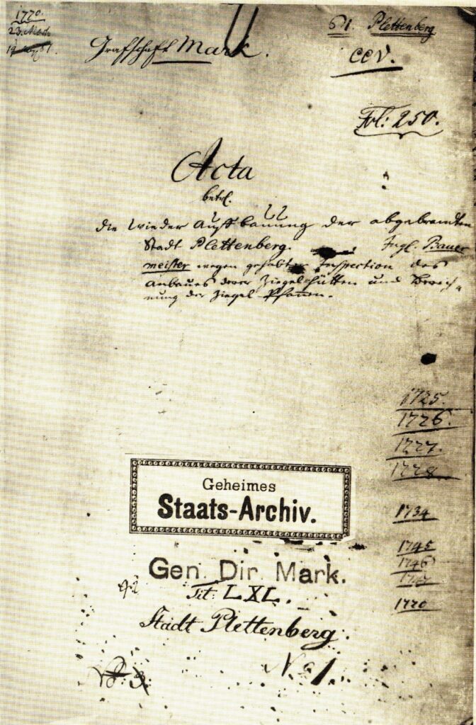 von Schwartzen (Bestand: Stadtarchiv, Verwendung genehmigt, copyright über Stadtarchiv, Rechte vorbehalten). Der Stadtplan wird im Zusammenhang mit dem Abschnitt über den Roman zum Stadtbrand von Plettenberg im Jahr 1725 gezeigt.