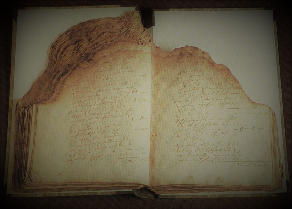Kopie des Brandberichtsdeckblattes aus dem Geheimen Preußischen Staatsarchiv und rechts Foto vom verbrannten Einnahmen- und Ausgabenbuch der Stadt, Fotos Weinbörner, Archive , Rechte vorbehalten