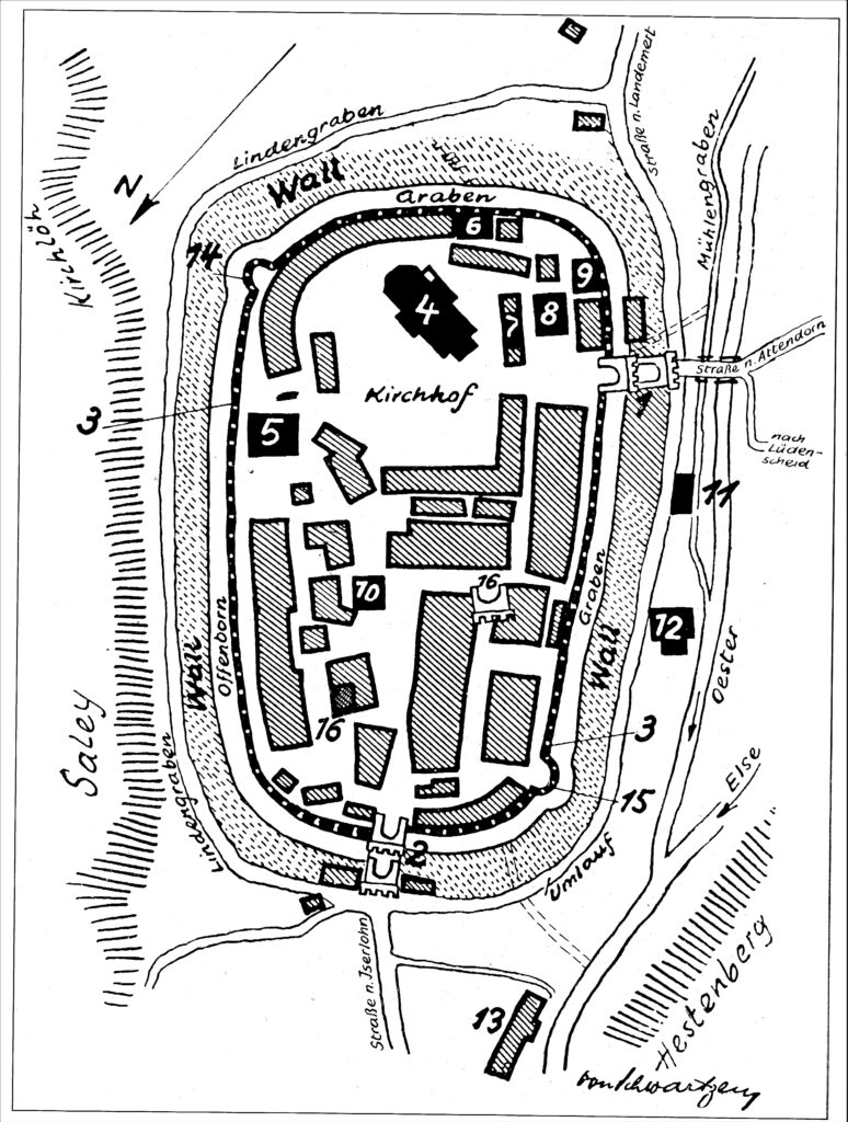 Abbildung: historischer Stadtplan des alten Plettenbergs zur Zeit des Stadtbrandes, gefertigt vom ehemaligen Stadtarchivar von Schwartzen, Kopie des Originals, Abdruck mit Genehmigung Stadtarchiv Plettenberg, nicht frei von Rechten.