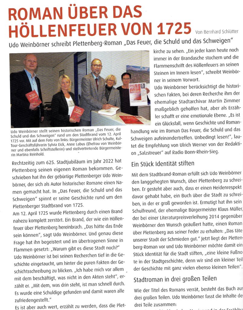 Besprechung von Bernhard Schlüter anlässlich der Präsentation des Romans im Plettenberger Rathaus. Pressetermin mit (von links nach rechts) Bürgermeister Ulrich Schulte,  Frau Silvia Eick,  Kultur-Geschäftsführerin, Auitorenpaar Weinbörner/Labus und die stellvertretende Bürgermeisterin Martina Reinhold. Ablichtung des Auszugs unter Hinweis auf den Artikel und den Verfasser Schlüter: KOMPLETT – Das Sauerlandmagazin, Rechte vorbehalten.