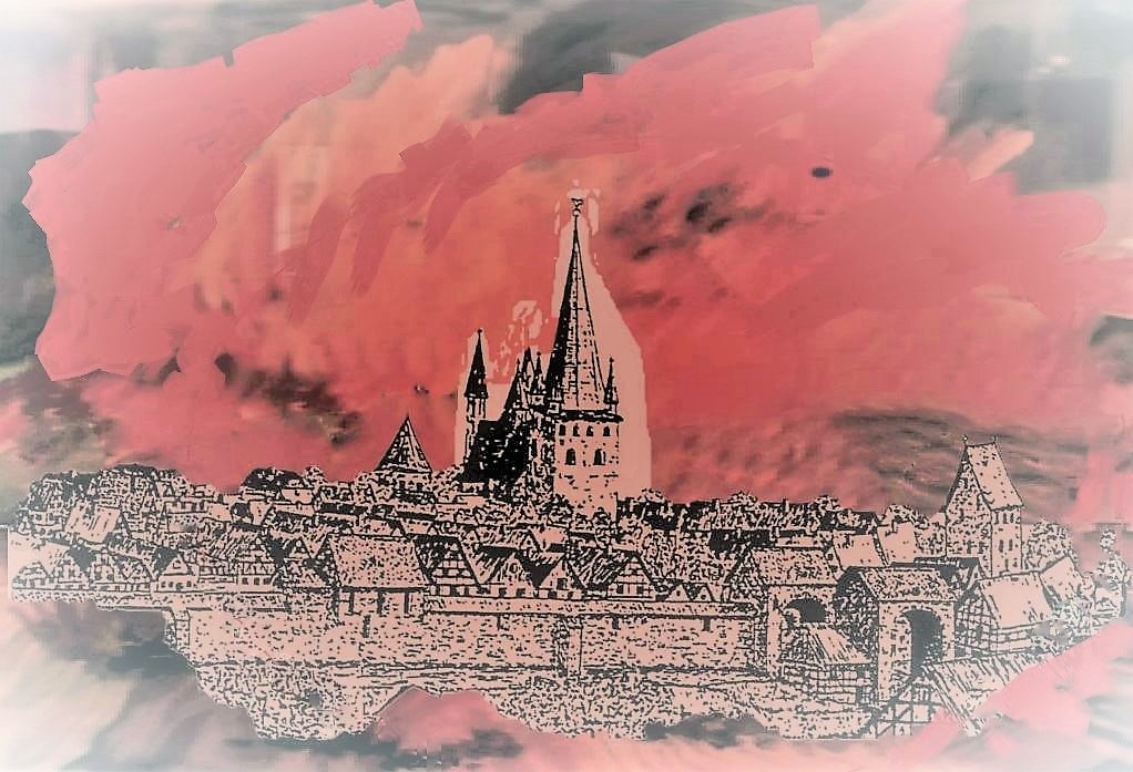 Entwurf des Romancovers (rechts) des Autors für den Graphiker, auf der Basis einer gezeichneten Stadtansicht des ehemaligen Stadtarchivars von Schwartzen; aus dem Entwurf entstand die Endfassung des Covers (Bild links). Grundlage historische Stadtansicht von Plettenberg, ©Stadtarchiv/©Wellhöfer Verlag.
