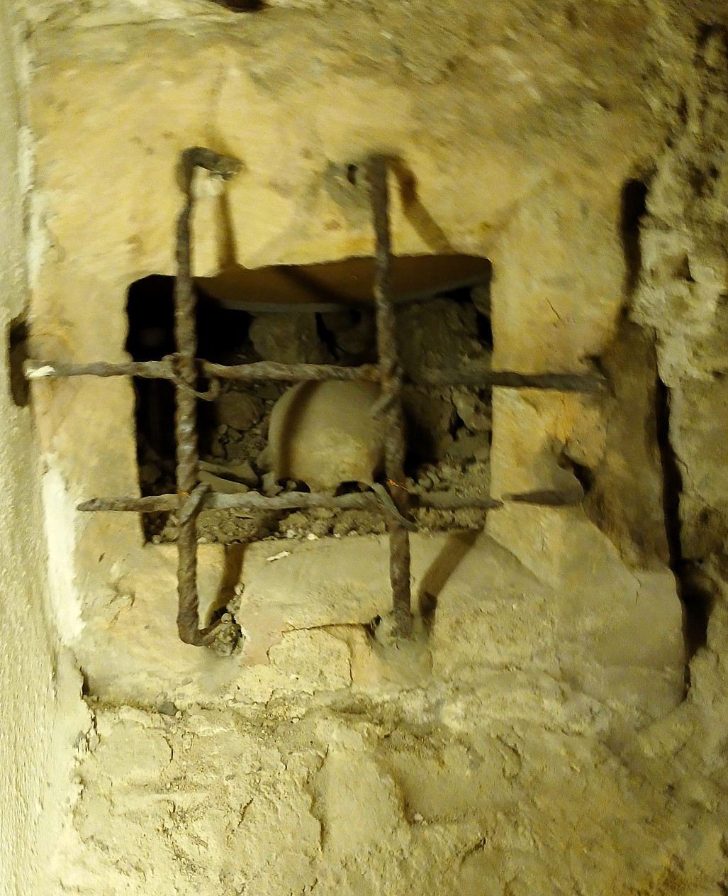 Foto von einem Totenschädel in einem quadratischen Loch in einer Kellermauer hinter Gitter, Foto Weinbörner in Schnütgen