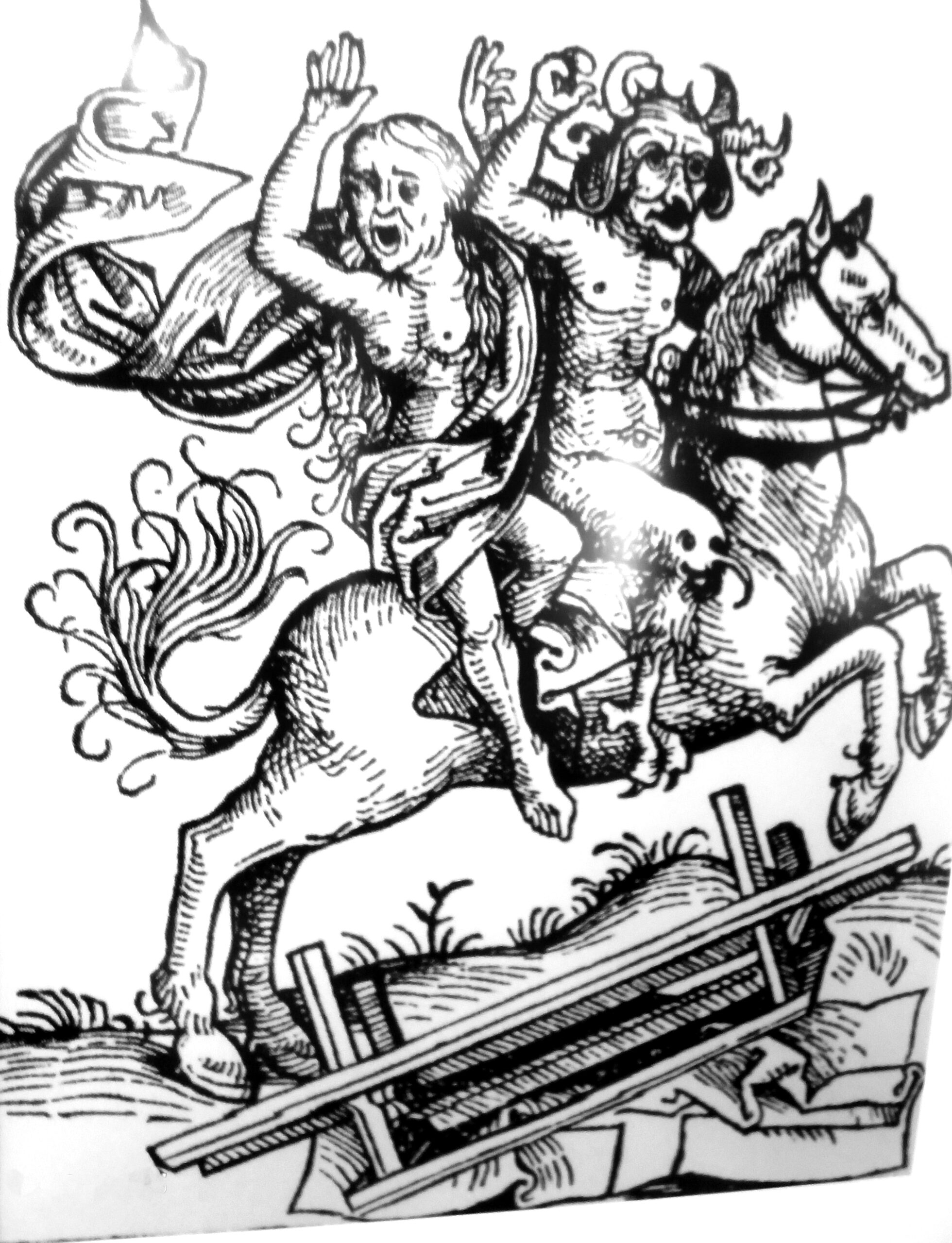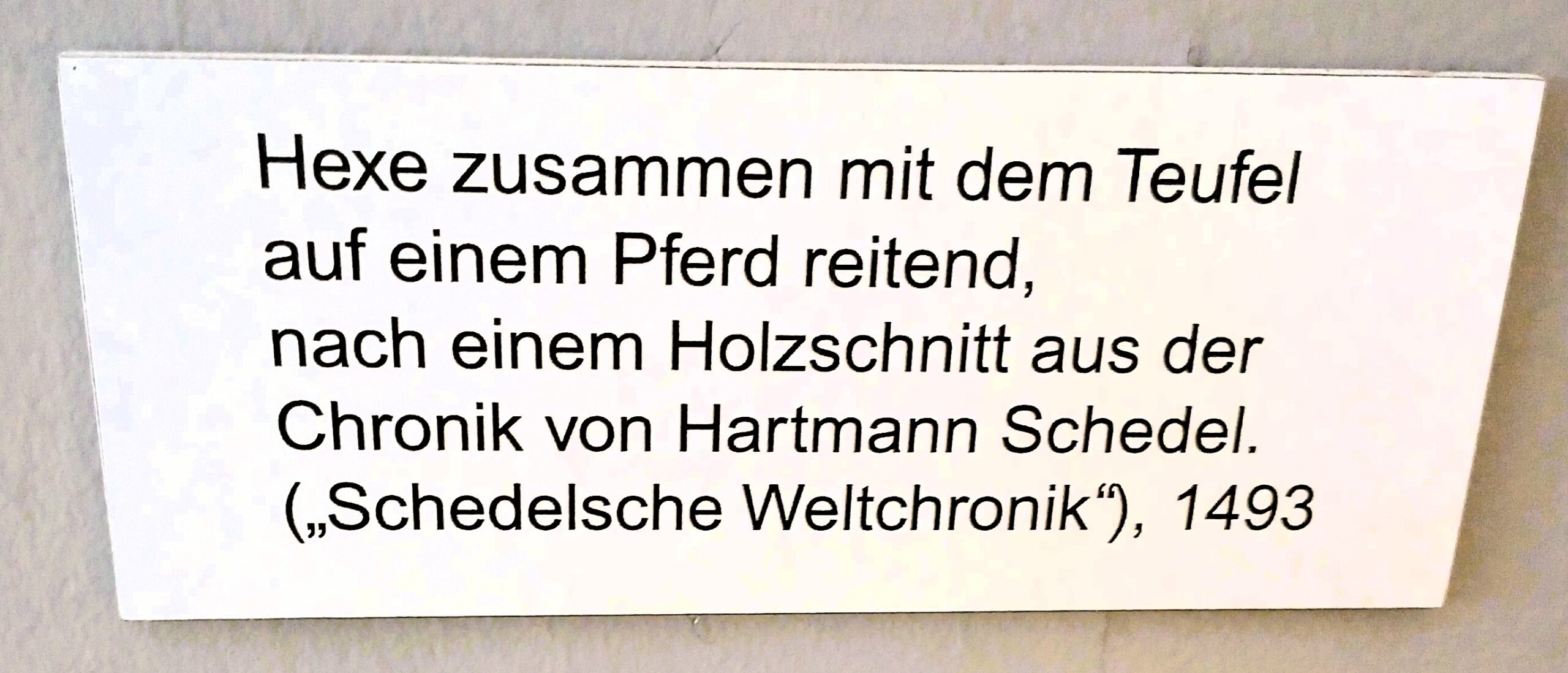- Kopie “Hexe und Teufel zu Pferd”, Schedelsche Chronik (Kopie einer historischen Illustration mit Hexe und Teufel zu Pferd aus der Nürnberger Chronik), Foto privat, für Nutzung Drittrechte prüfen.