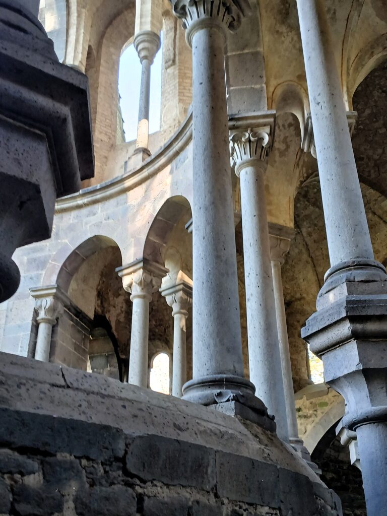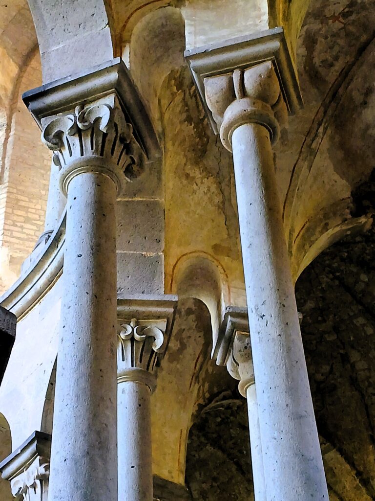 Zwei Fotos von der Reihe „Doppelsäulen“ im Chorkranz der Chorruine von Heisterbach. Eine bautechnische Besonderheit und eine mittelalterliche Bauleistung zur Stabilisierung des Bauwerks, Fotos Weinbörner, 2022, frei.