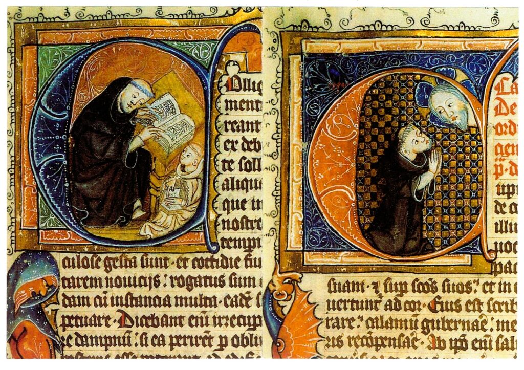 Abbildung zeigt Novizenmeister Caesarius von Heisterbach bei der Unterrichtung eines Novizen und wie er um Gottes Weisheit für seine Wundergeschichten bittet, Ausschnitte aus der mittelalterlichen populären Geschichtensammlung “Dialogus Miraculorum” des Caesarius von Heisterbach, hier von einer Broschüre der Klostergaststätte kopiert, Weinbörner. Bild unterliegt fremden Rechten. Es ist Teil einer Handschrift aus dem Kloster  Altenberg, die als Leihgabe der Stadt Düsseldorf dem Siebengebirgsmuseum für Austellung und Katalog zur Vfg. gestellt wurde (Düsseldorf, ULB, Ms.C 27, fol. 1r).