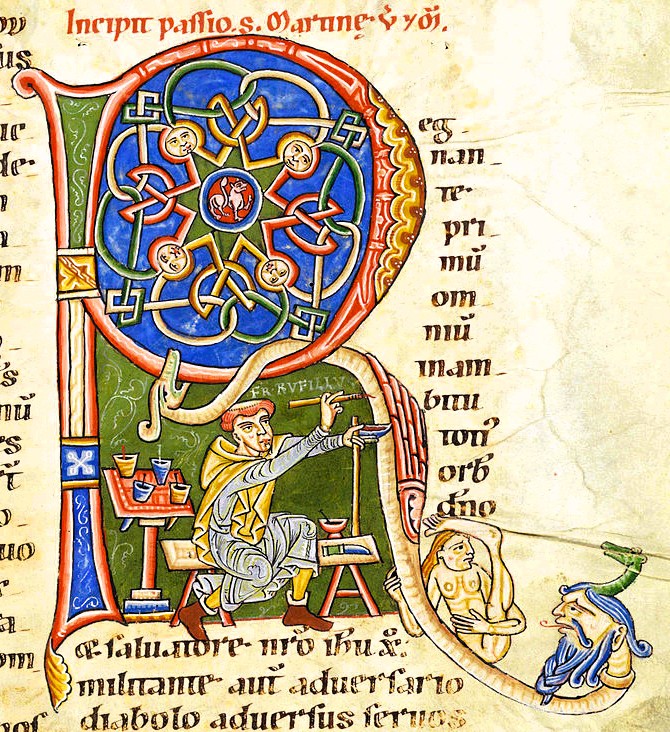 - Am Beginn des Textabschnitts: Illuminierter Manuskriptbuchstabe “R” mit der Figur eines mittelalterlichen Schreibers,u.U. Rechte vorbehalten.